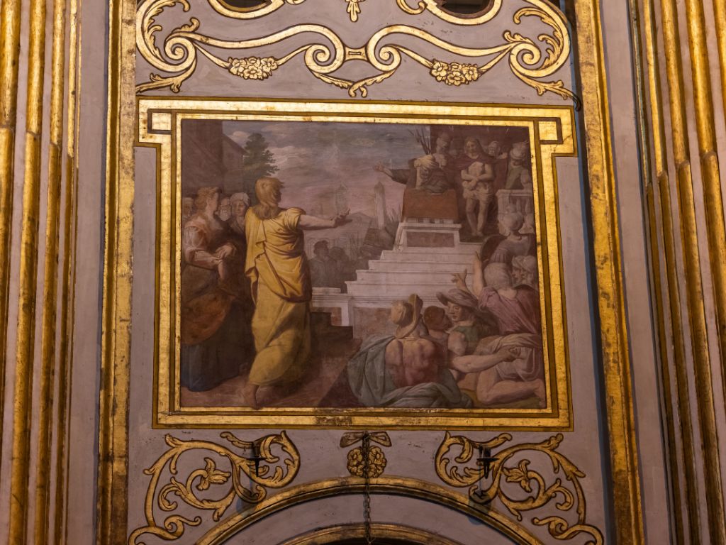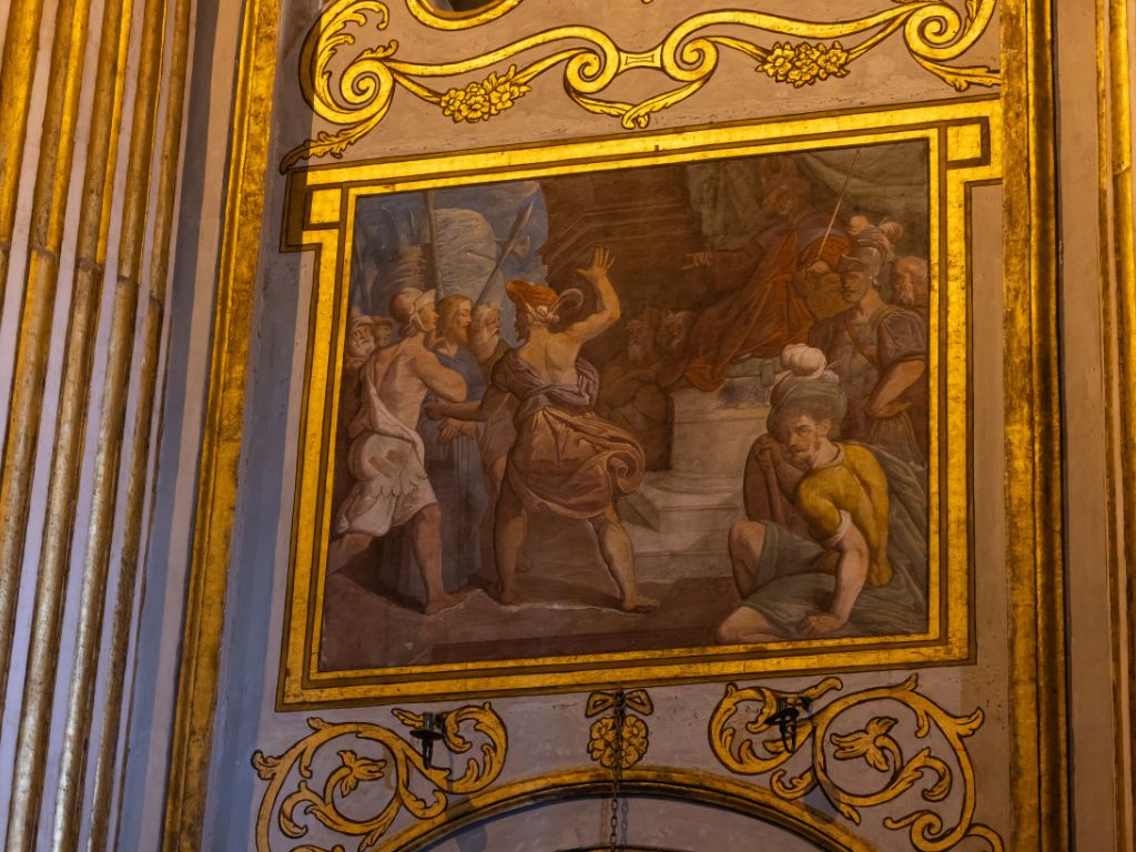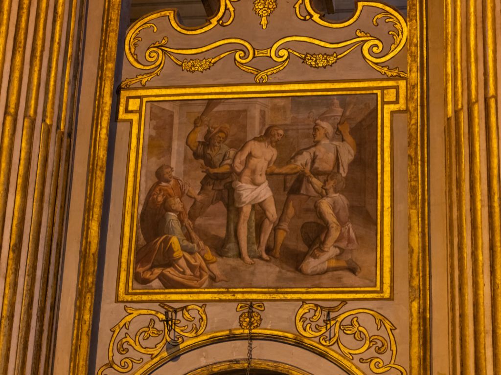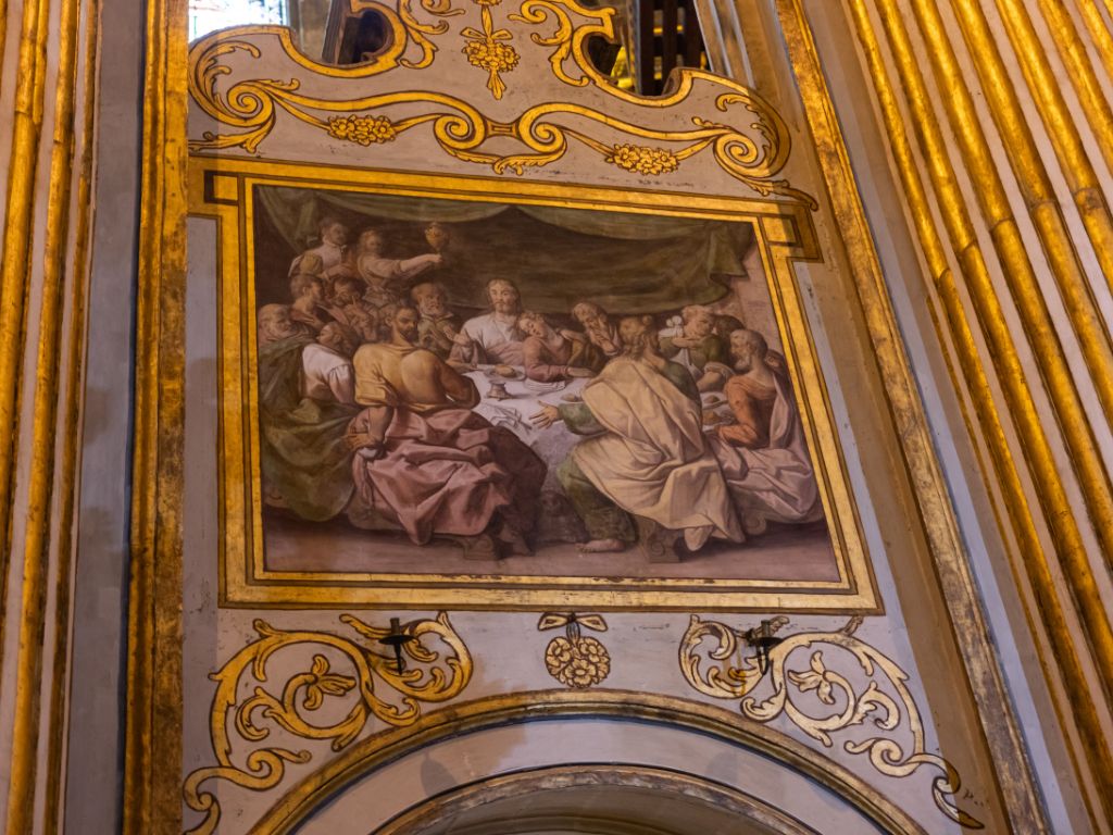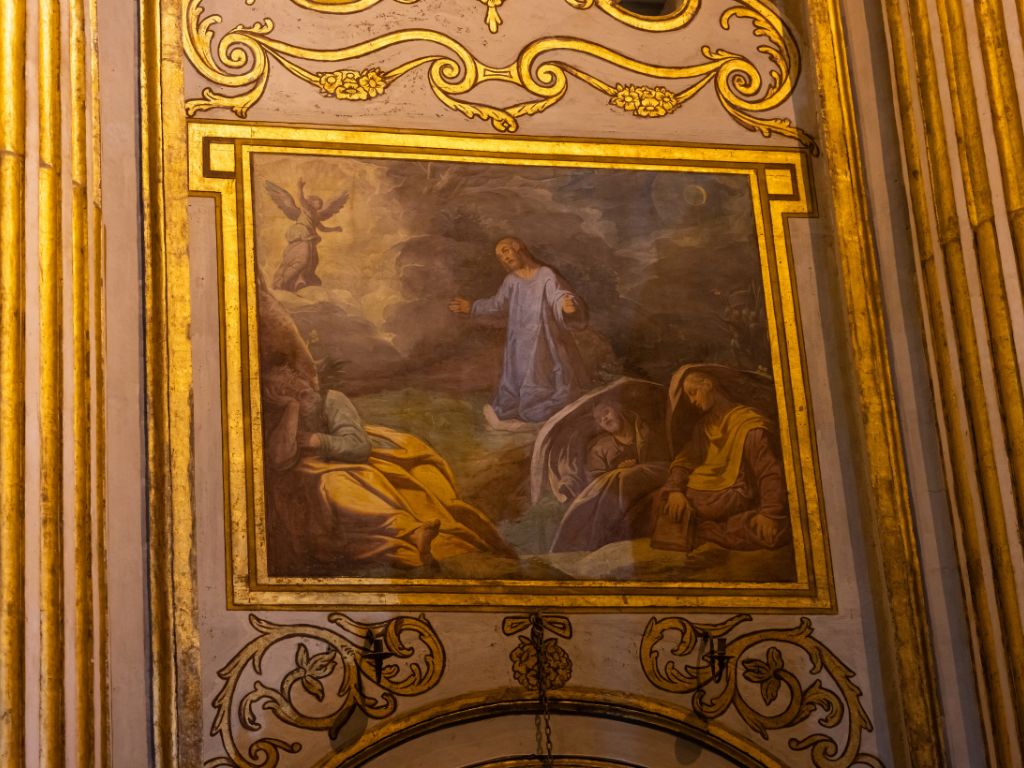 Nivel inferior: alrededor del tabernáculo, las pinturas narran escenas de la Pasión de Cristo, como Jesús en casa de Anás, la Oración en el Huerto, la Última Cena, Jesús ante Pilatos y la Flagelación.